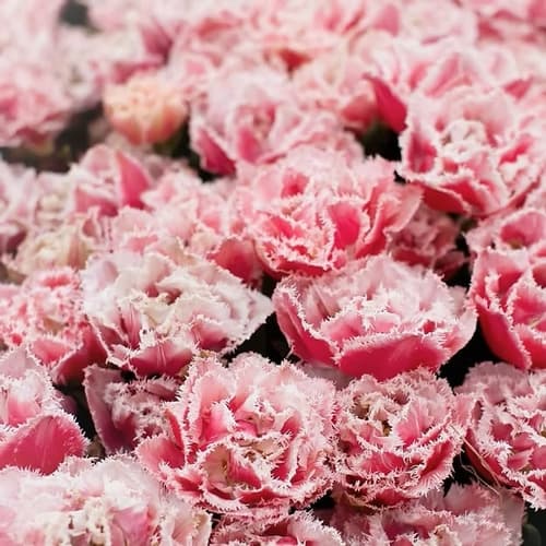 Náš absolutní favorit mezi plnokvětými tulipány. Růžovo-červené okvětní lístky jsou zvýrazněné světle růžovými volánky a zoubkovanými okraji a tvoří až 12 cm velký květ tulipánu Queensland.