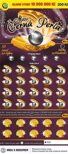 Zastavte se na chvíli a užijte si příjemné napětí se stíracím losem Maxi Černá perla. Každá je jedinečná, ale Maxi Černá perla může být i desetimilionová. Přesně taková je totiž její hlavní výhra. Pokud najdete symbol černé perly, vyhráváte dokonce pětinásobek částky uvedené pod ní. Uděláte radost sobě nebo někomu blízkému?