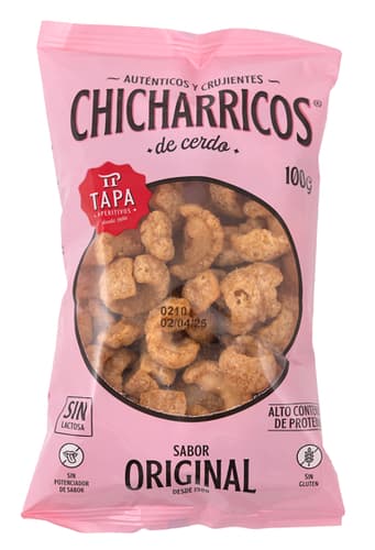 Chicharricos de cerdo jsou tradiční španělské chipsy z vepřové kůže, které vynikají výraznou chutí, dokonalou křupavostí a vysokým obsahem bílkovin. Autentická chuť Španělska v každém křupnutí. Bez lepku, laktózy a bez přidaných zvýrazňovačů chuti.