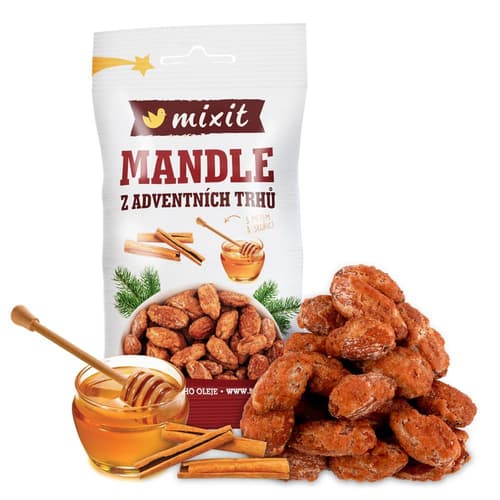 Pražené mandle v karamelu, medu a skořici – limitovaná vánoční kolekce. Pečlivě opražené mandle s karamelem, medem a skořicí v limitované edici inspirované vánočními chutěmi. Bez umělých barviv, aromat a palmového oleje. Ideální jako sváteční pochoutka nebo jedlý dárek.