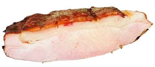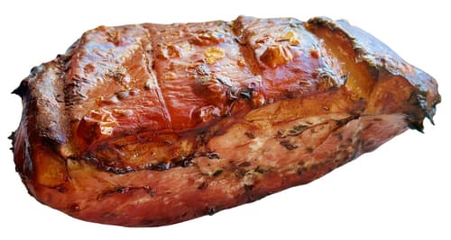 Sváteční pečená šunka sous-vide s kůží na povrchu. Je vyrobena z vepřového masa. Masný výrobek tepelně opracovaný.
