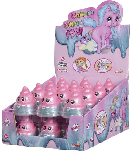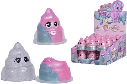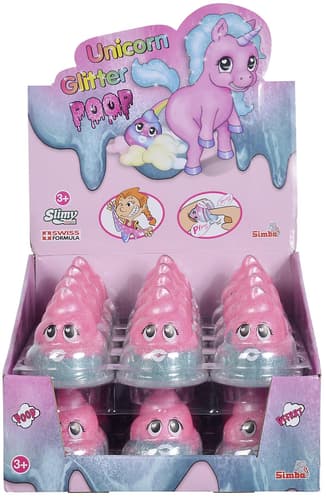 Slimy Unicorn prdící kelímek se třpytivým růžovo tyrkysovým slizem.