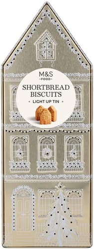 Sladké máslové sušenky v osvětlené vánoční dóze ve tvaru domečku. Dopřejte si jejich rozplývající se chuť a křehkou strukturu, ideálně se šálkem čerstvě uvařeného čaje.