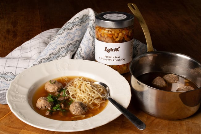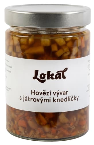 Pomalu tažený hovězí vývar s játrovými knedlíčky, masem a kořenovou zeleninou. Receptura vznikla v restauraci Lokál.