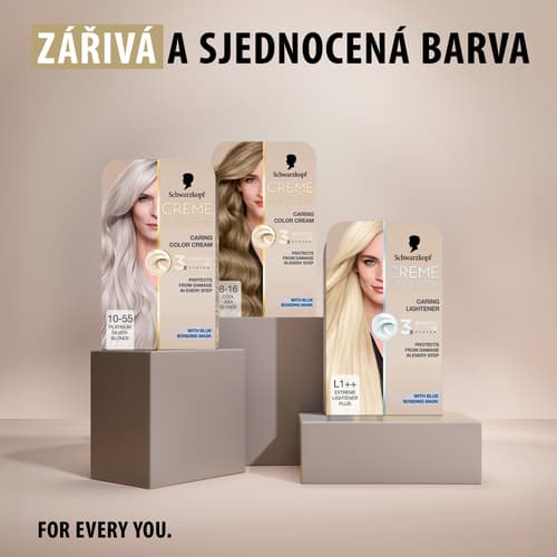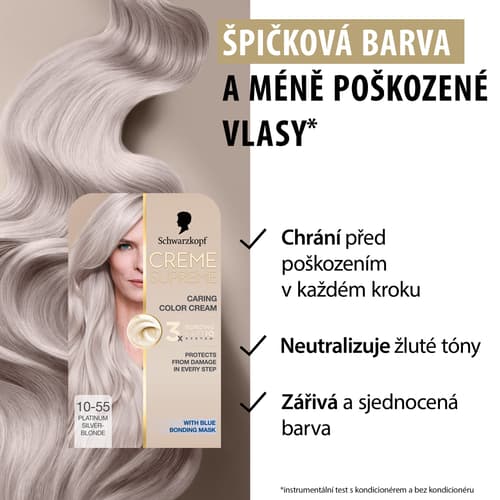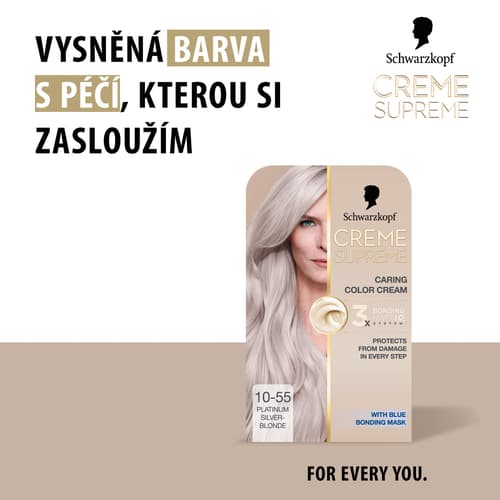 Schwarzkopf Creme Supreme barva na vlasy chladná stříbrná blond 10-55 přináší zářivý, chladný blond odstín s profesionální péčí o vlasy. Inovativní technologie 3x Bonding HaptIQ System posiluje vlasová vlákna, chrání je během barvení a zanechává je hladká, pružná a zdravě vypadající.