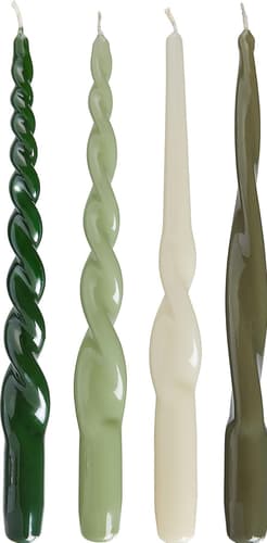 Sada čtyř zelených svíček. Oblíbený trik interiérových designérů: prvky, které jsou shodné, ale ne úplně identické, vytvářejí kouzelnou harmonii. Mírně odlišné tvary svíček vytvářejí právě tento efektní kontrast a dodávají prostřenému stolu harmonický, a přitom osobitý vzhled.