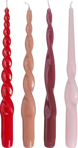 Sada čtyř červených svíček. Oblíbený trik interiérových designérů: prvky, které jsou shodné, ale ne úplně identické, vytvářejí kouzelnou harmonii. Mírně odlišné tvary svíček vytvářejí právě tento efektní kontrast a dodávají prostřenému stolu harmonický, a přitom osobitý vzhled.