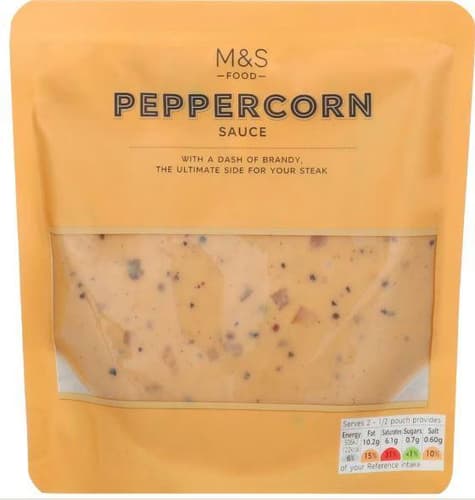 Creamy pepper sauce with butter and brandy from Marks & Spencer is the perfect complement to meat, grilled vegetables, or fries. The delicate combination of pink and green pepper, butter, and brandy gives dishes a distinctive flavor.