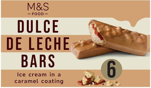 Dulce de Leche ice cream bars from Marks & Spencer combine creamy milk ice cream with crunchy cookie pieces. The bars are coated in a caramel glaze that adds a delicate sweetness.