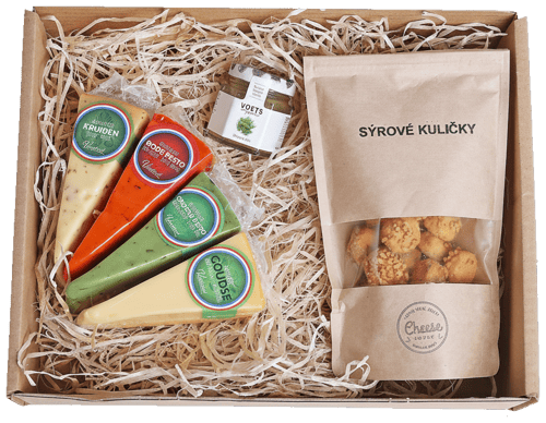 Cheese box long life contains a selection of vacuum-packed cheeses of 130 g each, complemented by a dip and cheese crackers. Thanks to vacuum packaging, the product has a long shelf life of up to 6 months.
