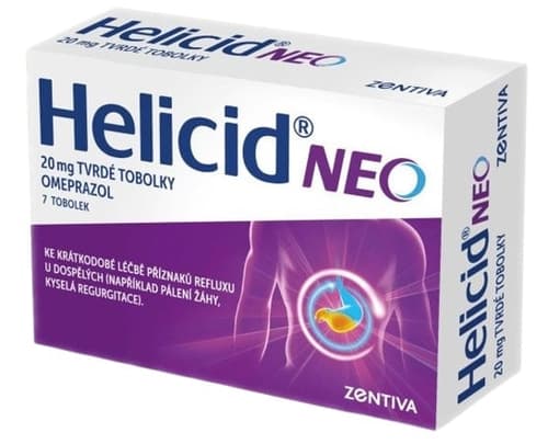 Helicid Neo obsahuje léčivou látku omeprazol, který patří do skupiny léčivých přípravků nazývaných „inhibitory protonové pumpy“. Účinkují tak, že snižují množství kyseliny, která se tvoří v žaludku. Tento přípravek se používá u dospělých ke krátkodobé léčbě příznaků refluxu (např. pálení žáhy, kyselá regurgitace). Reflux je návrat kyselého obsahu žaludku zpět do jícnu, který se může zanítit a bolet. To může způsobit příznaky, jako jsou bolestivý pocit pálení na hrudi stoupající až do úst (pálení žáhy) a kyselý pocit v ústech (kyselá regurgitace). Vhodné pro dospělé. Balení obsahuje 7 tobolek.