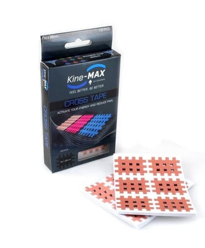 Zdravotnický prostředek. Kine-MAX Cross Tape (křížový tejp) je hedvábně jemná, neelastická, síťovaná páska ve tvaru mřížky, vyrobená z vysoce kvalitních materiálů a hypoalergenního lepidla. Mřížka má strukturu podobnou svalovým vláknům lidského těla, což přispívá k jejímu přirozenému působení na pokožku. Křížové tejpy se používají k podpůrné léčbě jizev a ke stimulaci spoušťových bodů (tzv. trigger points), akupresurních a reflexních bodů. Aplikují se podél toku meridiánů na bolestivá nebo napjatá místa, kde nalepením mřížky dochází k jemnému nadzvednutí kůže, uvolnění meridiánu a následnému zmírnění bolesti. Balení obsahuje 120 kusů křížových tejpů ve velikosti M (36 × 28 mm).