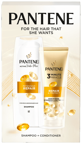 Pantene Intensive Repair gift set includes a shampoo and conditioner designed for the care of damaged hair. Thanks to the formula with PRO-V and ACTIVE NUTRI-PLEX technology, it cleanses the hair, provides nutrients, and helps improve its smoothness and shine.