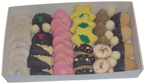 Vanilkové rohlíčky:pšeničná mouka,máslo(obsah mléčného tuku 82%),cukr,vlašské ořechy,obaleno vanilínovým cukrem(cukr bílý,aroma ethylvanilin).Linecké cukroví: pšeničná mouka, máslo /obsah mléčného tuku 82%/, cukr, vanilínový cukr/ cukr, aroma ethylvanilín, vaječný žloutek, citronová kůra.Košíčky-šuhajky:náplň(vlašské ořechy, rum,cukr, 100%jedlý pokrmový tuk),bílá poleva(plně a částečně ztužený tuk rostlinný palmojádrový,aroma, sušená syrovátka z mléka/6,7%/, sušené odstředěné mléko/0,3%/emulgátory, lecitiny, mléko.Kokosové kuličky: cukr, kokos, máslo /obsah mléčného tuku 82%/, rum /líh, aroma, tekutý invertní cukr, barvivo-karamel/,Plněné ořechy: pšeničná mouka, máslo/obsah mléčného tuku 82%/, cukr, vlašské ořechy.Tmavá poleva. Náplň: ořechový krém,Plněné košíčky: pšeničná mouka,máslo/obsah mléčného tuku82%/,cukr, vlašské ořechy. Tmavá poleva.Náplň: drobečky z lineckého těsta,vlašské ořechy,ovocná směs linecká,rum.Tmavá poleva.Vosí úly: vlašské ořechy,cukr,pasterovaný vaječný žloutek.Náplň:krém máslový,Máslové tyčinky strojkové: pšeničná mouka,máslo/obsah mléčného tuku 82%/, cukr, pasterovaný vaječný žloutek,citrónová kůra. Náplň: ovocná směs linecká.,Tmavá poleva – cukr, rostlinný tuk /palmojádrový/, kakaový prášek se sníženým obsahem tuku/, emulgátor/sójový lecitin a polyglycerol-polyricin-oleát/,aroma .Bílá poleva – cukr, ztužený rostlinný tuk / palmojádrový/ sušená syrovátka /z mléka/, sušené odstředěné mléko, emulgátory, /lecitiny/, aroma/.Růžová poleva – cukr, plně ztužený rostlinný tuk /palmojádrový/, rostlinný olej/palmový/, sušené mléko odstředěné, sušená syrovátka, emulgátor E322-sojový, aroma, barvivo /E120/,Žlutá poleva – s citronovou příchutí – cukr, rostlinné tuky /palmojádrový, palmový/, sušená syrovátka / z mléka/, sušené odstředěné mléko, emulgátor /slunečnicový lecitin E322/, přírodní citronové aroma, barvivo /kurkumin, karoteny/.linecká ovocná směs – fruktózo-glukózový sirup, směs ovocných dření /jablečná 17% hm., rybízová 15%hm., malinová 3%hm./, želírující látka:pektin, regulátory kyselosti: kyselina citronová, citronan sodný, aroma.Krémy: máslo, cukr moučka, vlašské ořechy nebo holandské kakao, Rum :voda,melasový líh, cukr, rumová tresť, barvivo karamel, vanilkové aroma