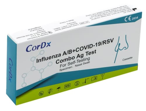 Diagnostický zdravotnický prostředek in vitro. Tento rychlý samotest umožňuje současnou detekci čtyř běžných respiračních virů – SARS-CoV-2, chřipky typu A a B a RSV. Je určen pro domácí použití a poskytuje výsledek už do 10 minut. Test se provádí jednoduchým výtěrem z nosu. Citlivost a spolehlivost testu jsou velmi vysoké. Balení obsahuje vše potřebné k provedení testu – testovací kazetu, sterilní odběrový tampon, zkumavku s pufrem a víčkem, držák zkumavek a příbalový leták s podrobným návodem.