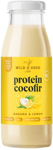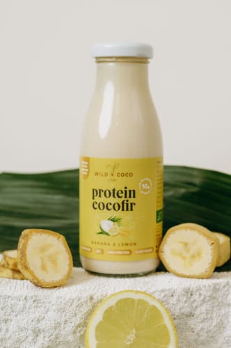 Protein drink WILD & COCO Cocofir Banana Lemon BIO is a fermented plant-based beverage with added banana and lemon purée. It contains 5 g of plant protein in each bottle, billions of friendly bacteria, and is histamine-free.