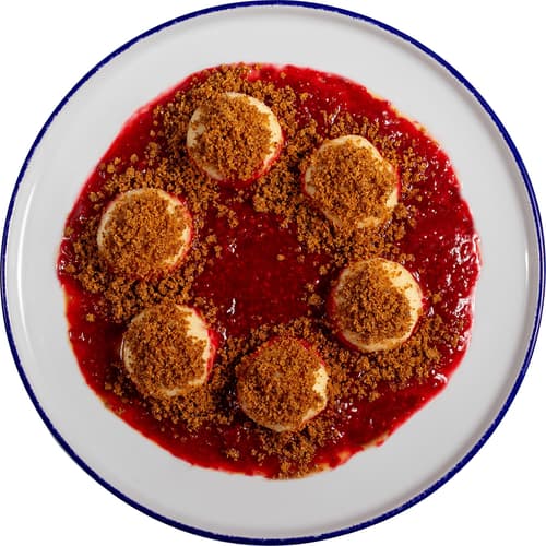 Indulge in these delicate cottage cheese dumplings from Cibule Bistro, expertly prepared by chef Filip Sajler. These Czech dumplings come with a delightful sweet and sour raspberry sauce and a fragrant gingerbread crumble. It's a convenient 330g chilled ready meal, perfect for a quick and delicious sweet treat when you're short on time.