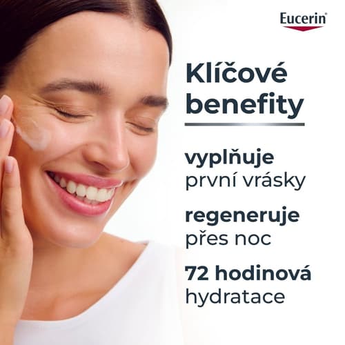 Eucerin HYALURON-FILLER+3xEFFECT hydratační noční gel – booster s kyselinou hyaluronovou, provitaminem B5 a glycerinem, který vyplňuje první vrásky, poskytuje 72hodinovou hydrataci a regeneruje pleť během noci. Probuďte se se svěží, zdravě vypadající a zářivou pletí. Vyplňuje první vrásky – díky kombinaci vysoko a nízkomolekulární kyseliny hyaluronové účinně vyhlazuje jemné linky a první vrásky. Intenzivně hydratuje pleť – poskytuje 72hodinovou hydrataci. Regeneruje pleť během spánku – svěží pleť hned po probuzení. Ultralehká gelová konzistence – rychle se vstřebává bez pocitu mastnoty. Vhodný pro všechny typy pleti – včetně citlivé pleti. Balení obsahuje 50 ml.