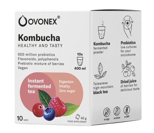 Ovonex Kombucha is a refreshing instant fermented black tea, conveniently packed in single-use sachets, delivering the authentic taste of traditional kombucha. Featuring a natural berry blend including blackcurrant and raspberry, and containing SCOBY, its gentle drying process preserves all vital nutrients. This pack includes 10 sachets, each 4g.