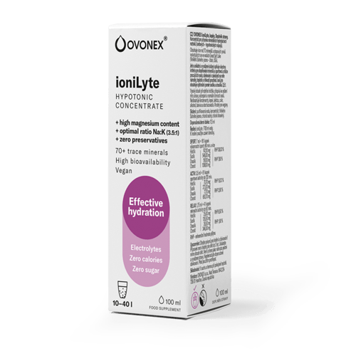 Doplněk stravy. Ovonex ioniLyte je doplněk stravy a iontový nápoj plný minerálů. Vytvořte si vlastní iontový nápoj během několika sekund. Koncentrát iontů ioniLyte doplňuje nezbytné minerály v horku, při sportu, fyzické práci nebo kdykoli během dne. Stačí jej přidat do svého oblíbeného nápoje. Má skvělou vstřebatelnost a jako hypotonický iontový nápoj hydratuje rychleji a efektivněji než samotná voda. Obsahuje více než 70 minerálů a stopových prvků z Velkého solného jezera v Utahu a má optimální poměr sodíku a draslíku 3,5:1 pro minerální rovnováhu v těle. Je bez cukru, bez dalších sladidel a bez chuti, takže přidáním do svého oblíbeného nápoje nezkazíte jeho chuť. Z jednoho balení můžete připravit 10-40 litrů iontového nápoje. Je veganský. Nepřekračujte doporučené denní dávkování. Uchovávejte mimo dosah dětí. Doplňky stravy nejsou náhradou pestré a vyvážené stravy. Balení obsahuje 100 ml.