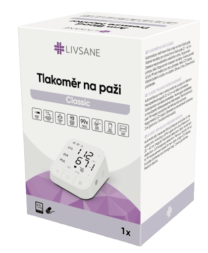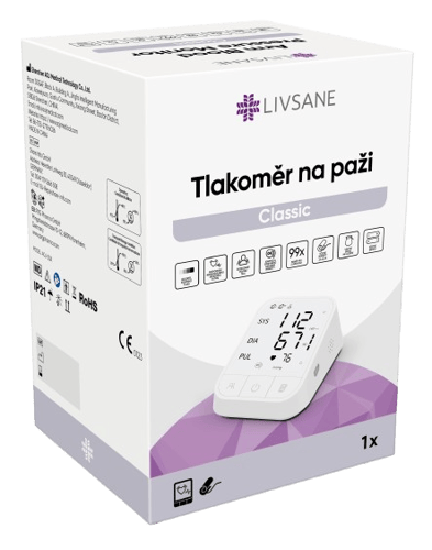 Zdravotnický prostředek. LIVSANE Tlakoměr Classic automaticky měří krevní tlak a tep na horní části paže. Sledujte svůj krevní tlak rychle, přesně a pohodlně – přímo z domova. LIVSANE automatický tlakoměr vám poskytne spolehlivé výsledky jediným stiskem tlačítka, a díky chytrým funkcím zajistí, že měření proběhne správně při každém použití. Hlavní přednosti: Velký přehledný LCD displej – rozměr 81 × 83 mm, úhlopříčka 109 mm. Barevné zobrazení výsledků – 4barevný systém (zelená/oranžová/červená) pro snadnou orientaci dle hodnoty tlaku. Pohodlná univerzální manžeta – pro obvod paže 22–42 cm. Kompletní balení – včetně baterií a praktického úložného sáčku. Pokročilé funkce: Detekce nepravidelného srdečního rytmu. Upozornění na pohyb těla během měření. Kontrola správného nasazení manžety. Paměť pro dva uživatele – až 99 záznamů pro každého. Balení obsahuje: Tlakoměr na paži, manžeta 22 – 42 cm, mávod k použití, sáček na uložení, rychlý návod, baterie AAA (4 ks).