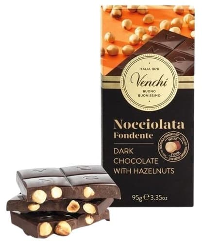 Venchi - dark chocolate 60% with hazelnuts from Piedmont. Made from the highest quality cocoa beans, I. G. P. Piedmont hazelnuts, and olive oil. Venchi is one of the most popular chocolate brands in Italy, known for its quality and representing tradition and innovation that make Italian chocolate unique. Our artisan chocolatiers carefully select the best cocoa beans and use traditional techniques to create chocolates that are delicious and beautiful. Venchi chocolate is made only from the purest ingredients and never compromises on taste. Venchi offers a wide range of premium options, each created to enhance the enjoyment of artisan chocolate. Venchi celebrates every nuance of cocoa, selecting only the best ingredients to highlight chocolate in all its forms — from bars to gelato. Venchi offers various types of chocolate, including dark, milk, and white chocolate, unique blends, and flavors. Venchi is known for its quality and tradition in the chocolate industry. Venchi is an Italian food company, founded in 1878 by Silviano Venchi, headquartered in Castelletto Stura (CN). It specializes in the production and sale of chocolate and ice cream. Venchi primarily focuses on the production of chocolate, which is offered in various variants. New recipes are developed every year, distributed in different formats. Venchi uses selected ingredients, without the use of palm oil and with low sugar content. The main ingredients include Piedmont IGP hazelnut and green pistachio Bronte DOP. Venchi S. p. A. adopts a sustainability strategy based on three main pillars: product, planet, and people. For example, the company is committed to reducing the environmental impact of packaging. Venchi has more than 1600 employees (2024), divided into various locations: Castelletto Stura (CN), where the production plant is located, Milan (headquarters), and four regional offices in New York, Shanghai, Beijing, and Hong Kong. Venchi has more than 180 stores in more than 70 countries. Venchi is known for its traditional chocolate products, such as Gianduiotto and Cremino, as well as its own recipes, such as Chocoviar chocolate caviar. Venchi has received several awards, including the Vassoio D'Oro at Eurochocolate in Perugia in 2004 and several Tavoletta D'Oro awards for quality chocolate. Venchi was a supplier at events related to the Nobel Peace Prize award in 2007.