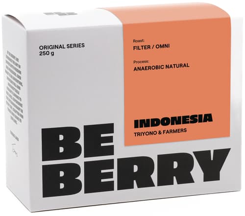 BeBerry Coffee Indonesia Triyono is a whole bean coffee with a distinctive flavor profile. This coffee from the Kerinci region in Sumatra offers notes of blueberry jam, mango, and red wine. Thanks to anaerobic natural processing, it has a complex body and unique sweetness.