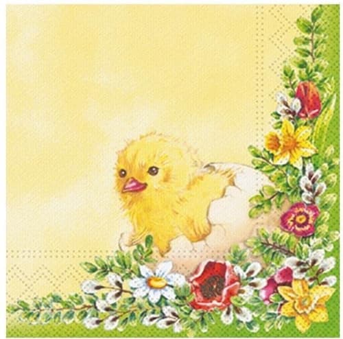 Poland,Easter napkins MFP are decorative paper napkins featuring a chick surrounded by spring flowers in warm yellow and green tones. Thanks to their three layers of paper, they are sturdy and absorbent, making them suitable not only as decoration but also for everyday use.