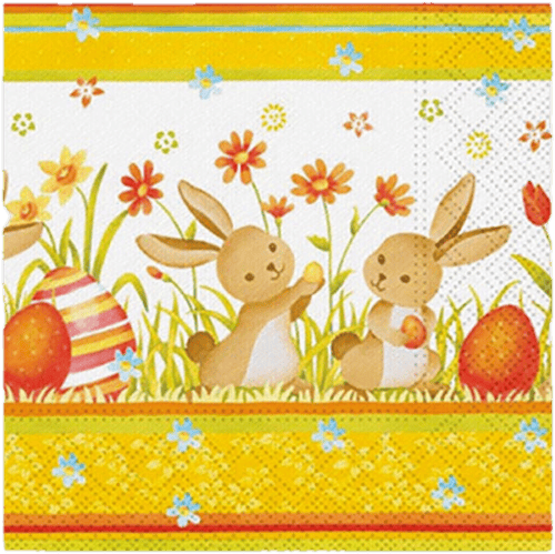Poland,Easter napkins by MFP featuring designs of bunnies, flowers, and colorful eggs bring a spring atmosphere to your table. They are made of sturdy three-ply paper that absorbs well.