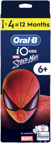 The Oral-B iO Kids replacement electric toothbrush head with the Marvel Spiderman design is intended for children aged 6 and up. Extra-soft bristles and a small round head are designed for children’s mouths.