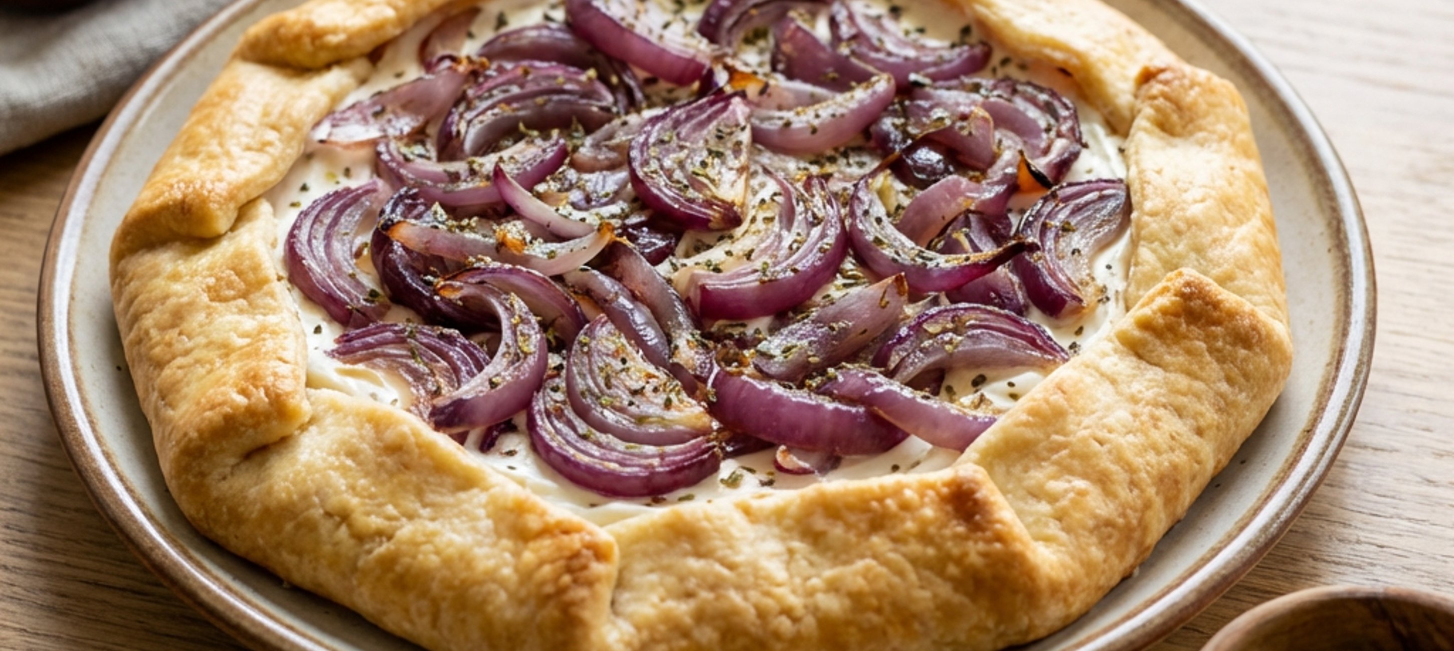 - 3Peel the onions and slice them into thin half-moons. In a bowl, mix them with oil and a pinch of salt, trying to separate the individual layers of the onion. Then spread this beauty over the seasoned cream. Place in the oven and bake for 25-30 minutes, until the edges turn golden and the onions are also golden.