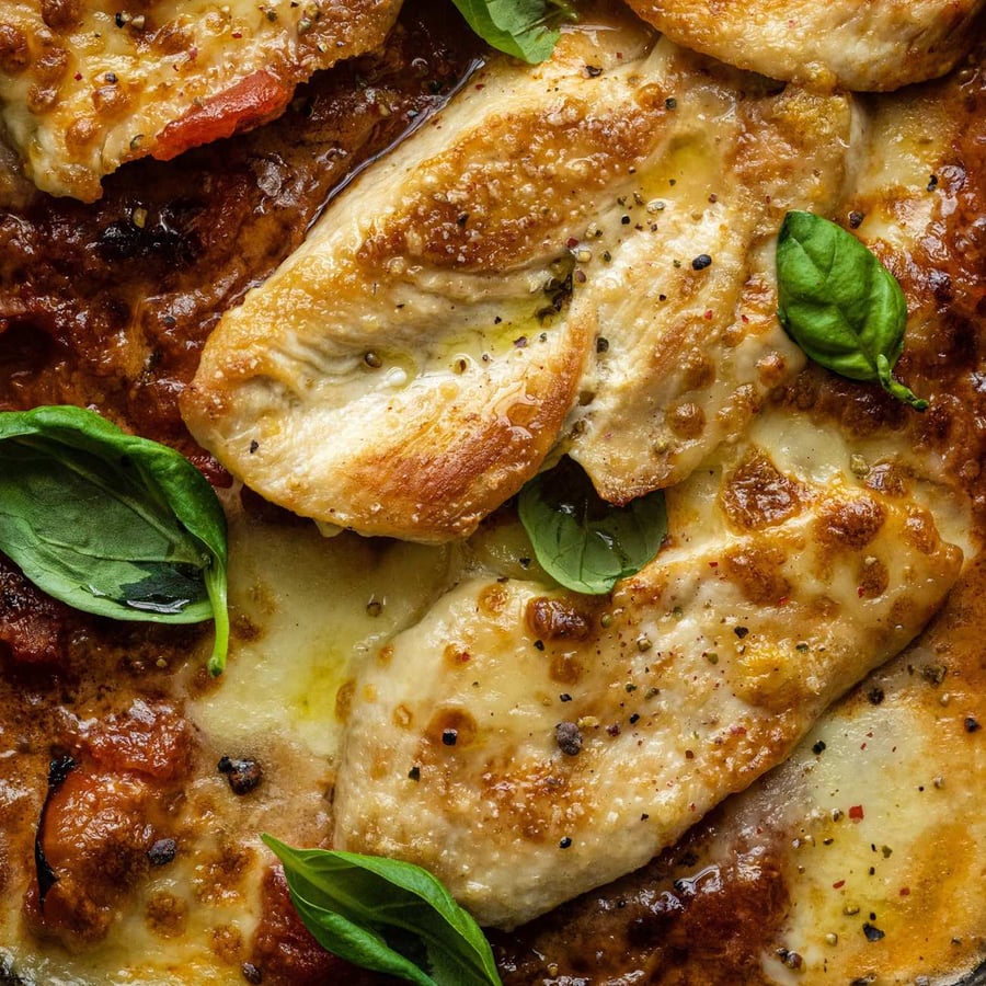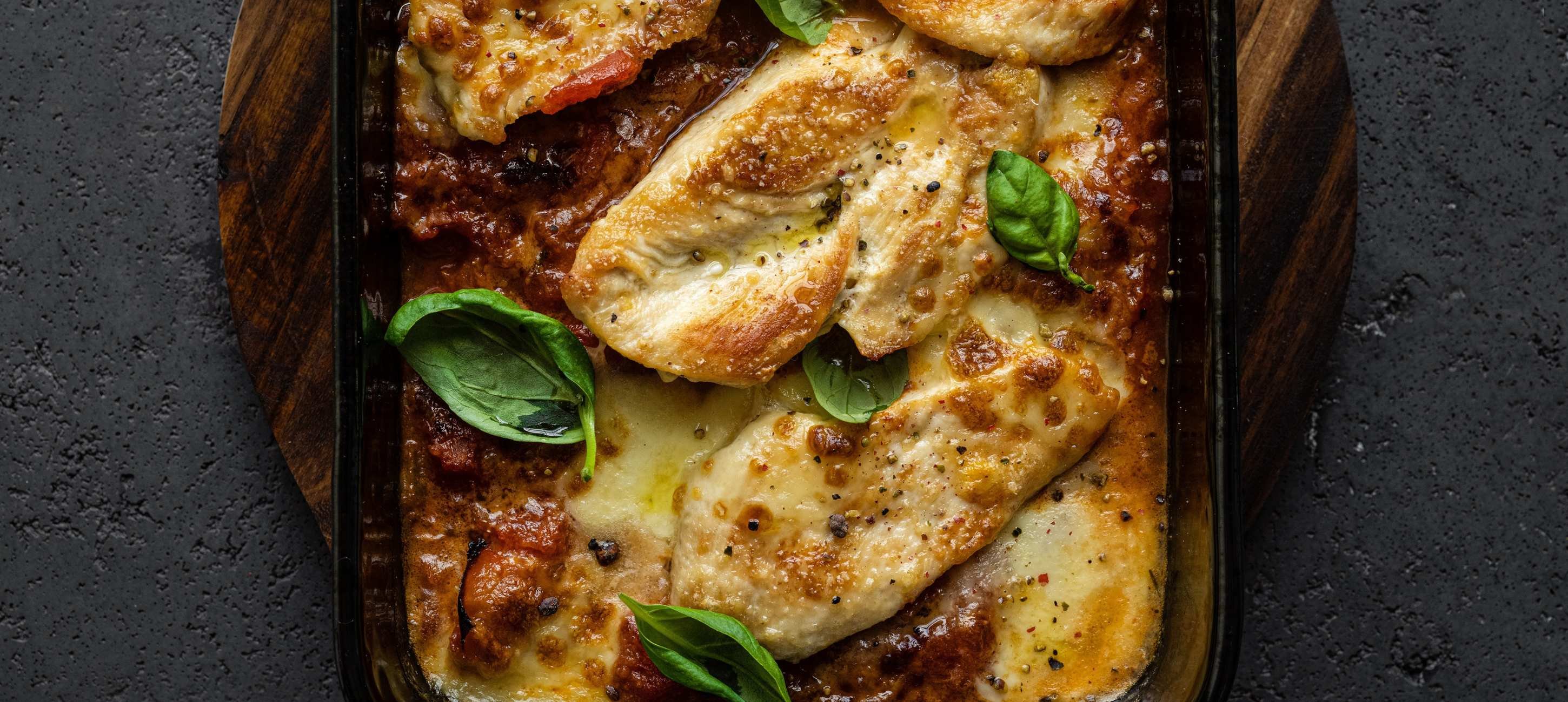 - 4Transfer the finished tomato mixture to the baking dish. Place the fried chicken breasts on the mixture, add slices of mozzarella, and sprinkle everything with grated Parmesan. Place the baking dish in the preheated oven and bake for 13–15 minutes at 200–210 °C.