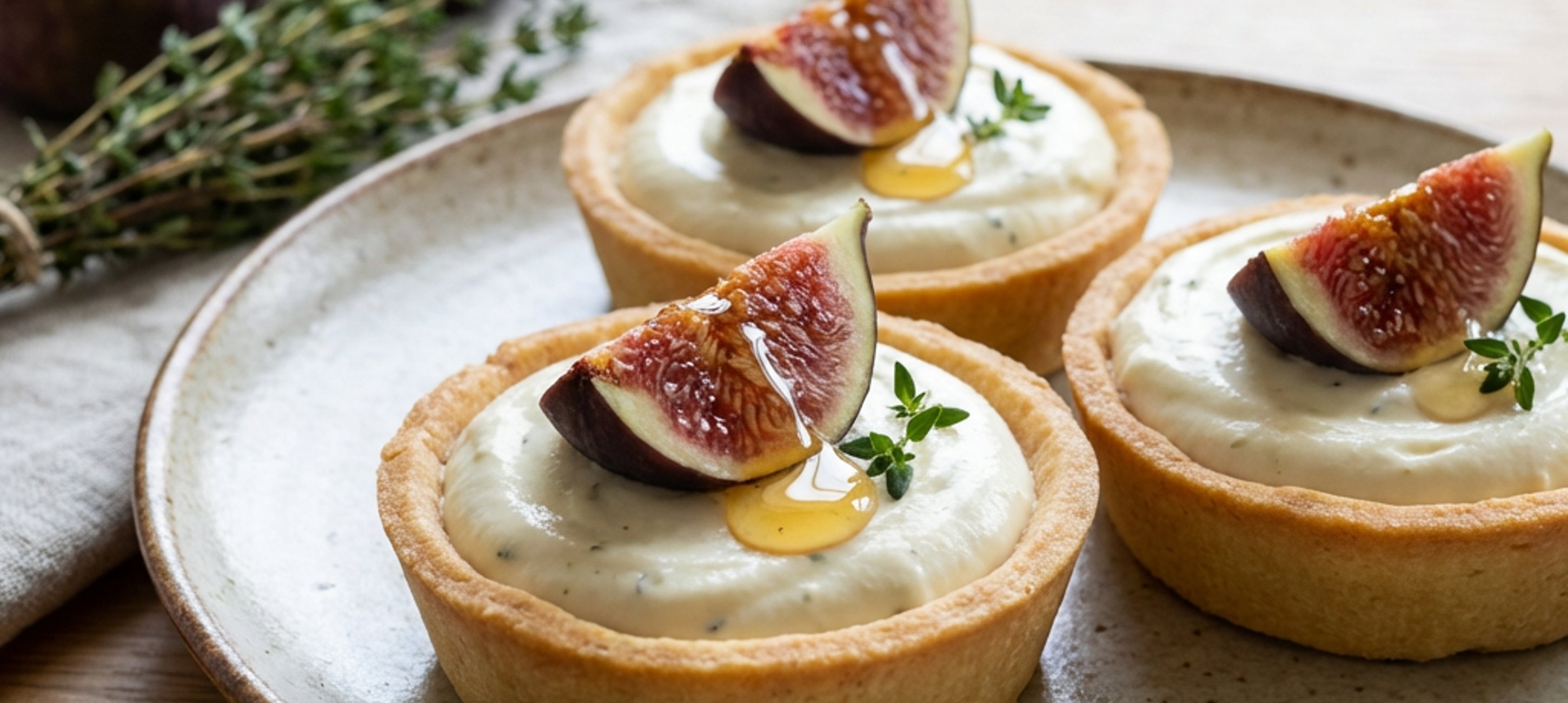 - 1Fill a piping bag with a round, wide-opening nozzle with the cream and decorate the tarts. Place them in the refrigerator for 15 minutes to firm up slightly. Wash the figs and cut them into eighths. Place an eighth of a fig on each tart, drizzle with honey, and for decoration, you can add a sprig of thyme.
