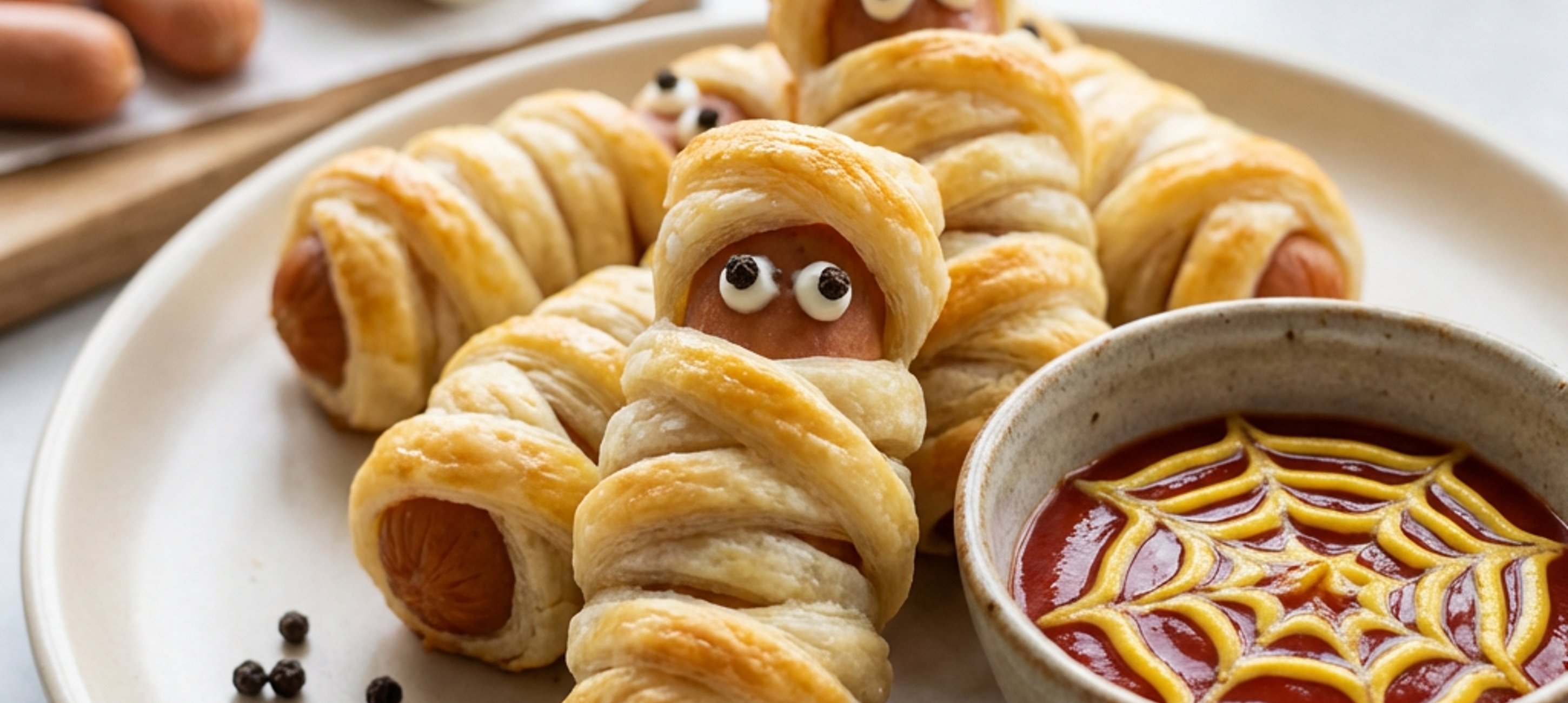 - 5After removing from the oven, let the blind mummies cool for a while. Once cooled, add the eyes. The eyes will be placed in the gap you prepared for them when wrapping the puff pastry around the sausage. Take a little cream cheese on the back of a spoon, the part you usually hold, and place it in the eye spot. Decorate each white mound of cheese with a black peppercorn. Some may find it easier to scoop the cheese using a toothpick or skewer.