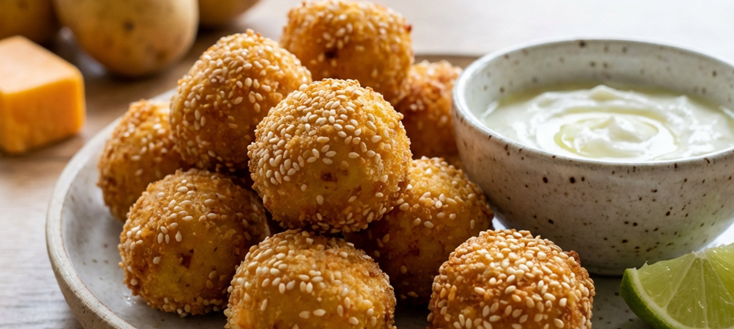 - 2Form balls about 2–2.5 cm in diameter from the dough. Roll each ball in sesame seeds and place the balls on a baking sheet lined with parchment paper. Place the baking sheet in the preheated oven and bake the croquettes at 160–170 °C for 12–15 minutes until golden.