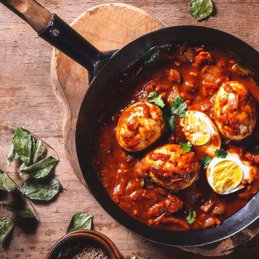 - 5In a separate pan, heat oil and add 10 g of tikka paste along with hard-boiled, peeled eggs. Cook until a crispy layer forms on the eggs (until the egg whites on the surface of the eggs lightly brown).