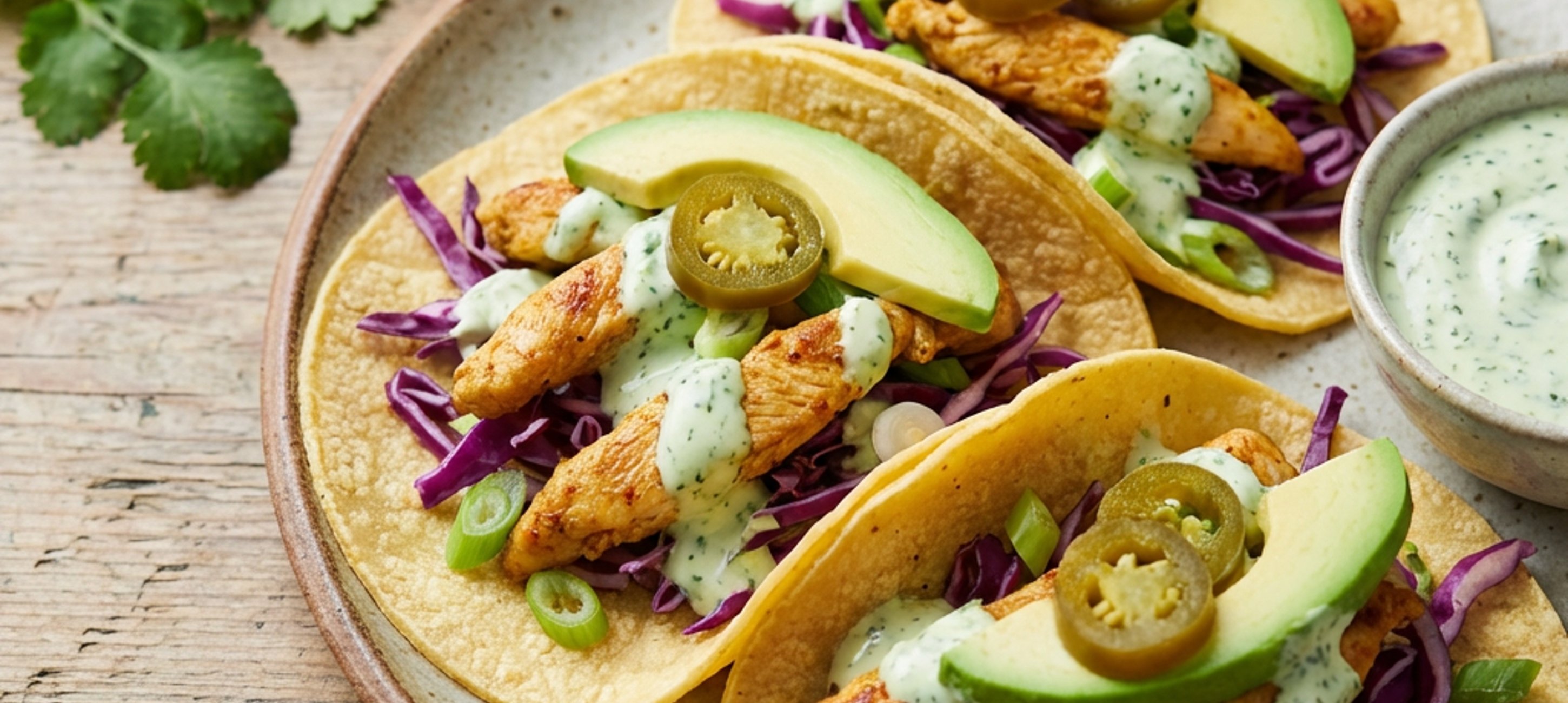 - 3In a large bowl, mix the red cabbage with jalapeños, spring onion, and coriander dressing. Let stand for 15 minutes. Then add the chicken and mix. Season with salt, pepper, and serve the mixture in a corn tortilla. Finally, garnish with avocado.