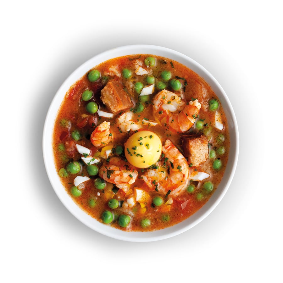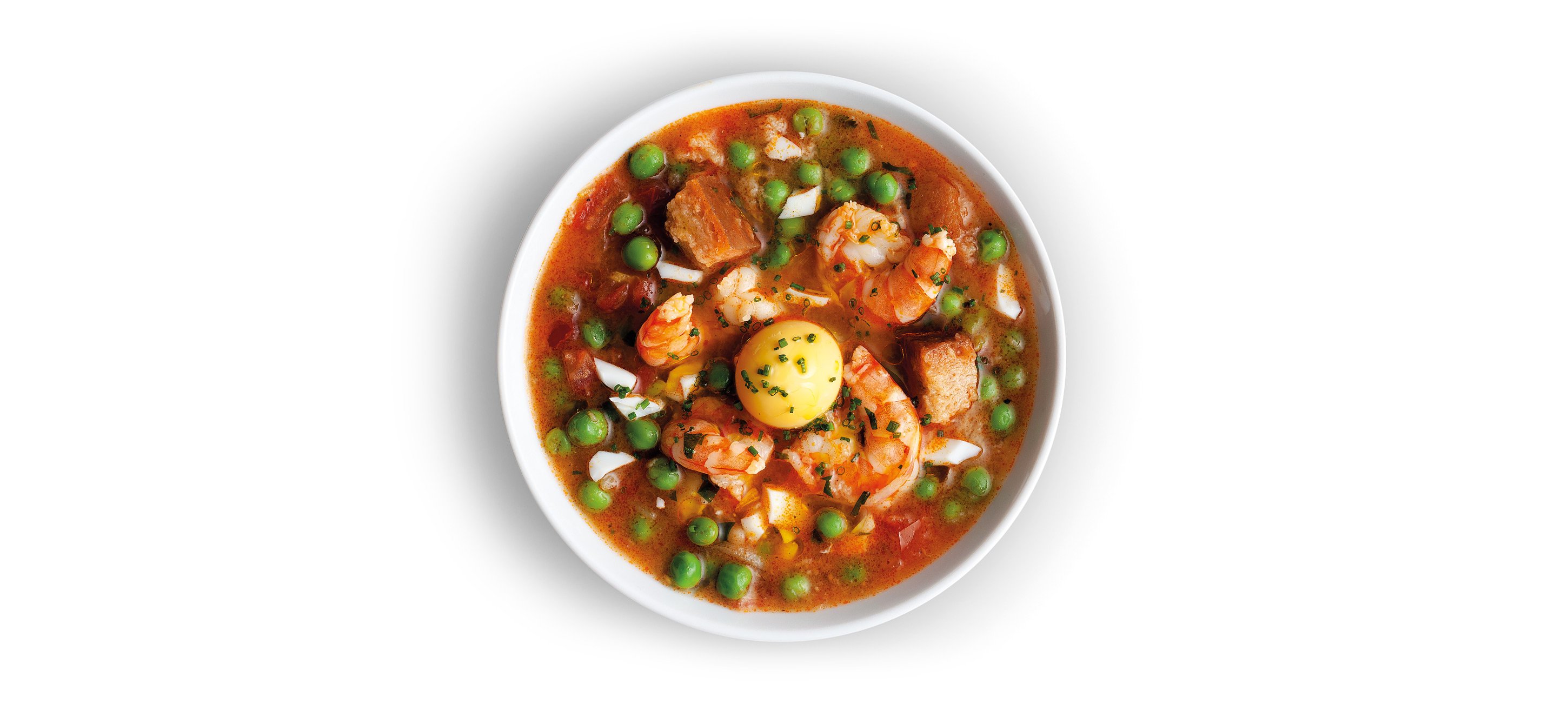 - 7Vývar z krevet přecedíme do kastrolu se zeleninou, osolíme, opepříme a vaříme 2 minuty. Přidáme nakrájený chleba a vaříme další 3 minuty. Přidáme nakrájená rajčata, hrášek a krevety, necháme 1 minutu prohřát a stáhneme z ohně.