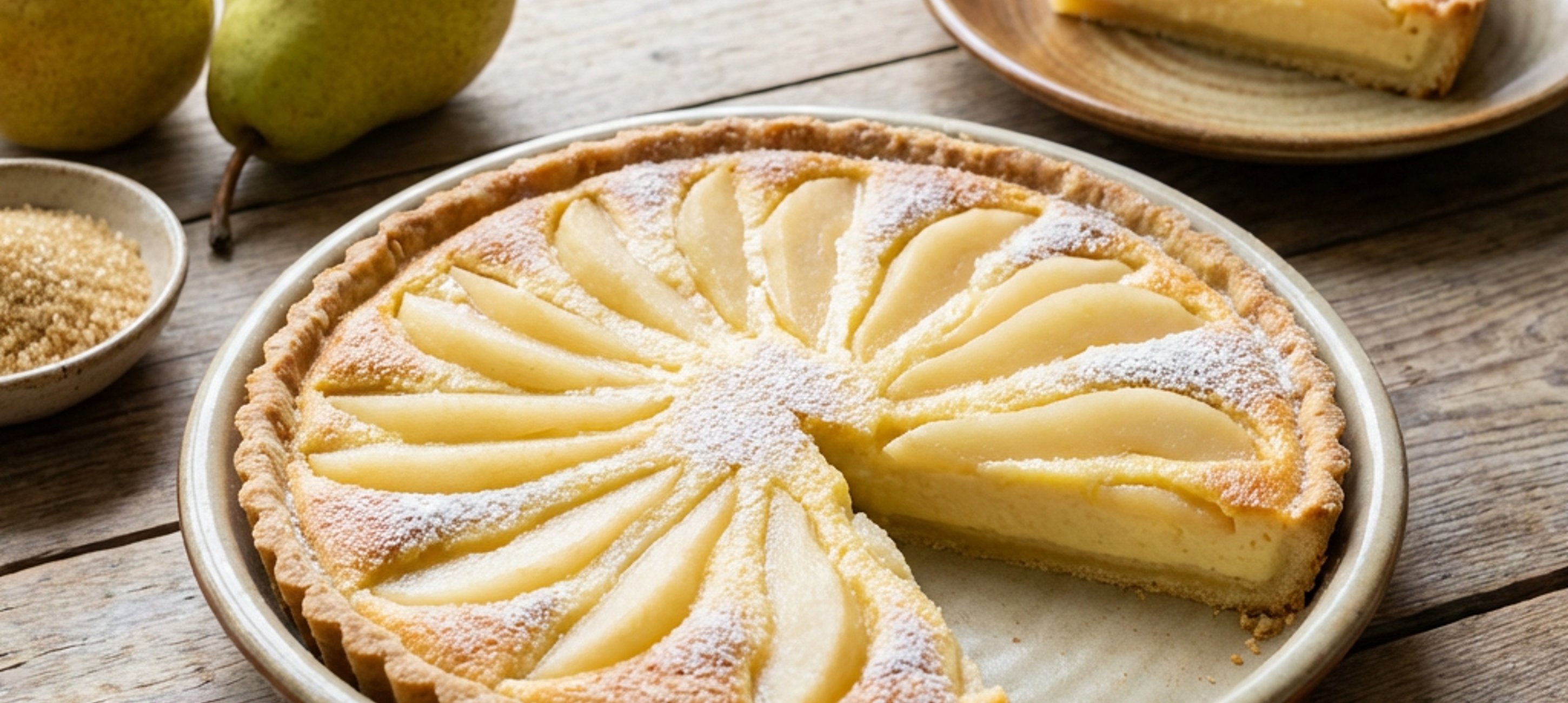 - 1Pour the curd mixture into the prepared tart form and arrange the pear slices on the surface (partially submerge the bottom edge of the pear slice into the curd) so that you always place one half of the same pear from the edge of the form to the center.