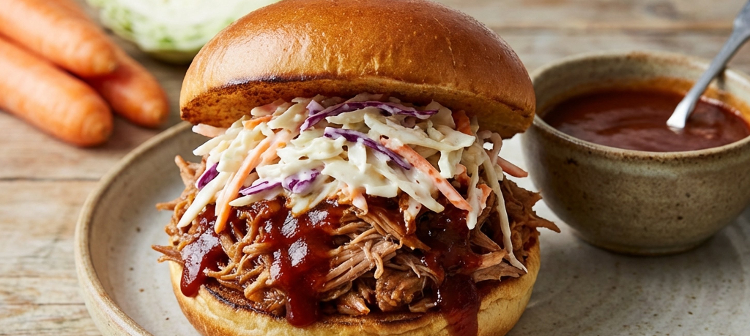 - 1Cut the hamburger bun in half and spread one half with BBQ sauce. Then add the pulled pork (heated). Place a desired amount of coleslaw on the meat. Cover with the other half of the bun and serve.