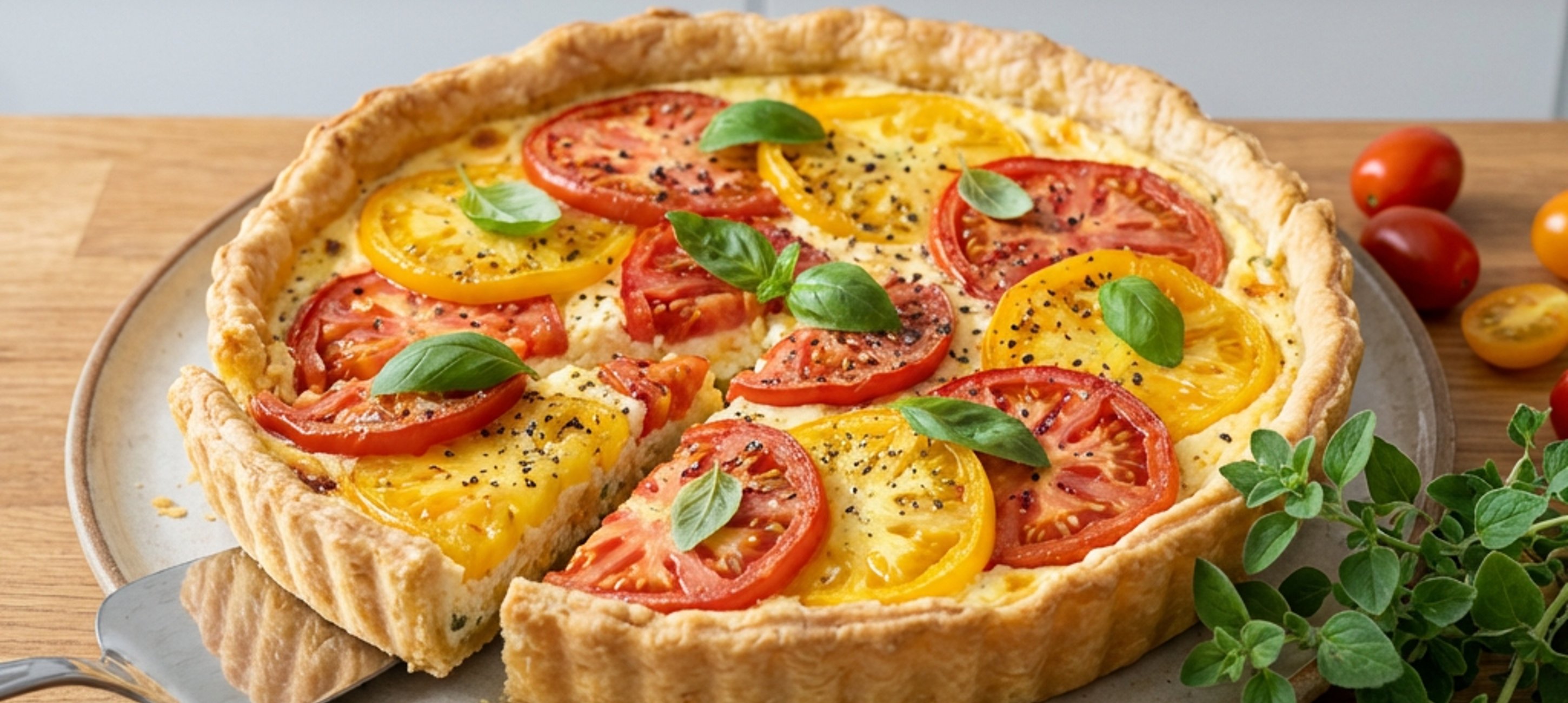 - 3Pour the prepared filling into the tart pan and arrange the tomato slices evenly on top, they can slightly overlap. Place in the preheated oven and bake for about 60 minutes, or until the tart is lightly golden and the tomatoes are soft.