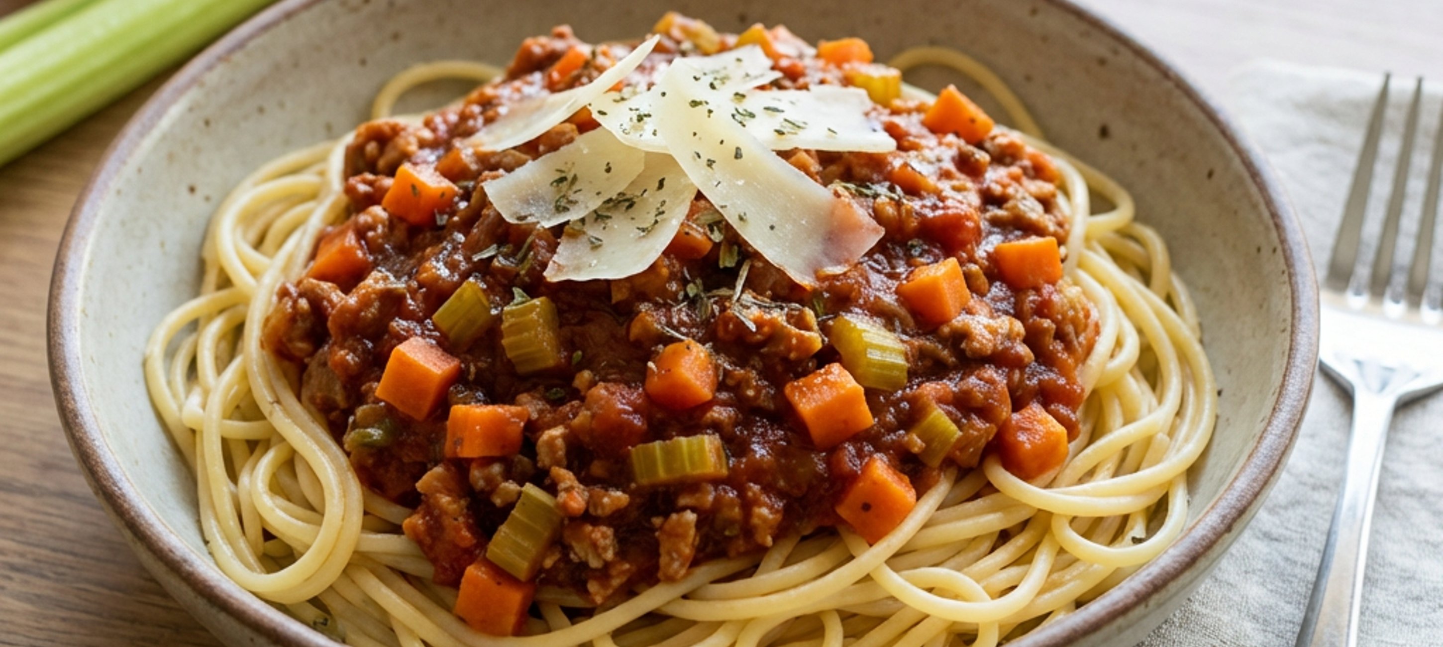 Serve the finished Bolognese sauce with spaghetti and Parmesan shavings. You can also freeze it – it will last up to 6 months in the freezer.