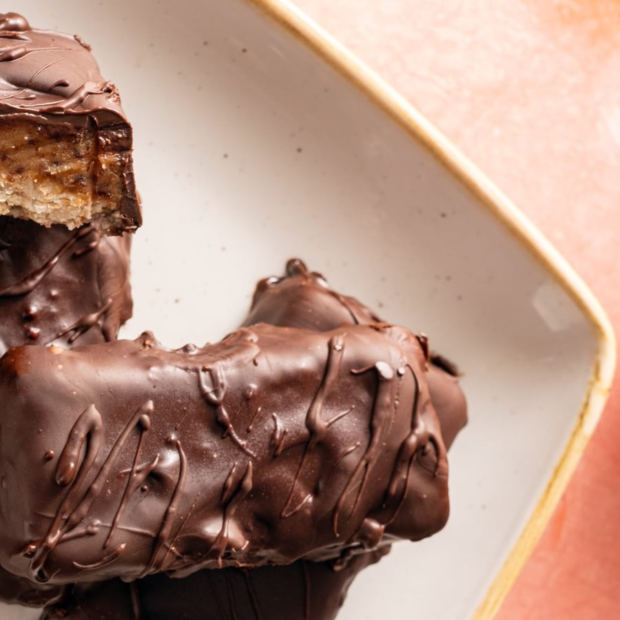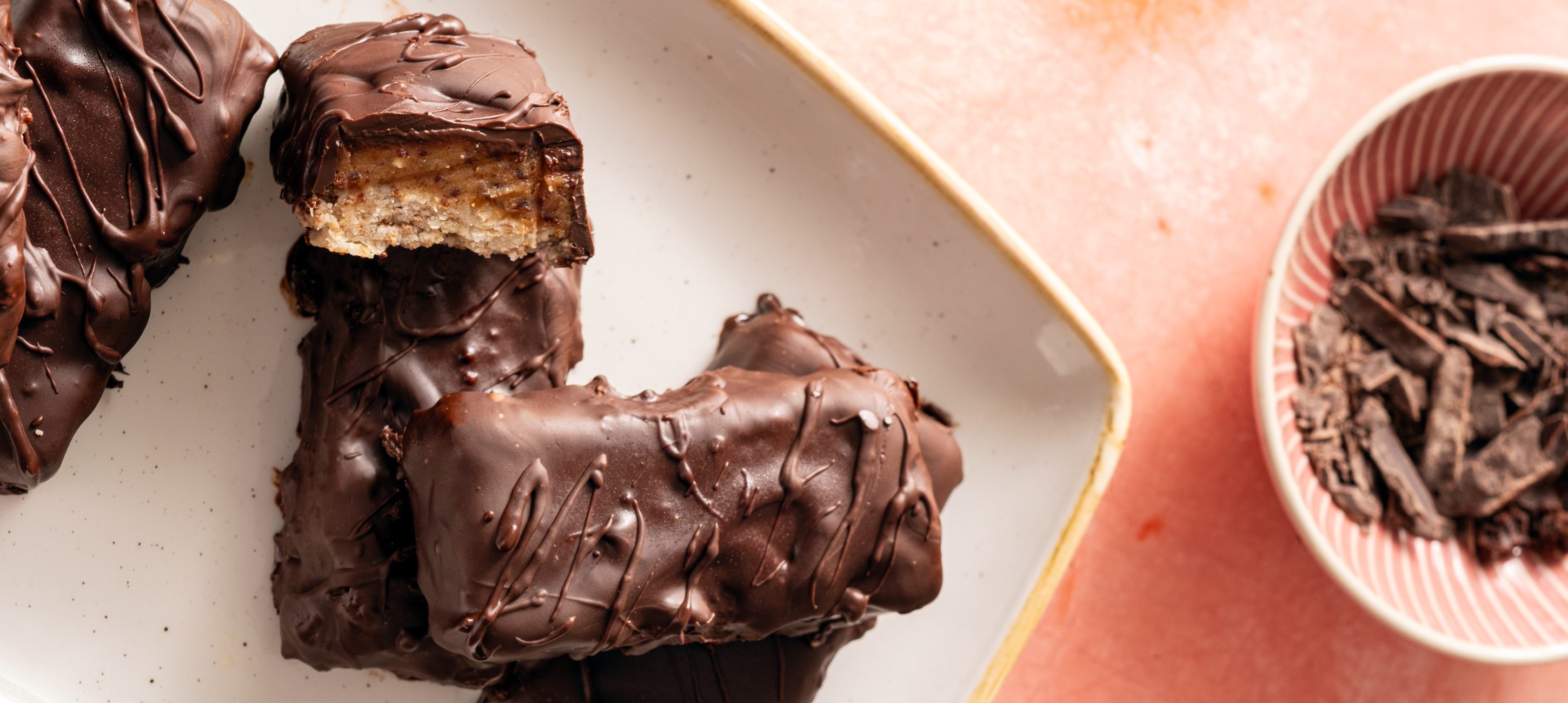 - 4Once the mixture in the container is firm, remove it from the fridge onto a work surface and cut it into 6 equally sized bars. Coat each bar in the melted chocolate and place them in the fridge for at least 10 minutes to set. Once set, you can serve them.