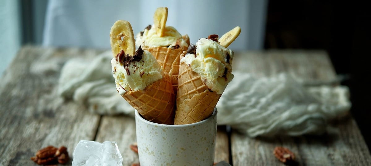 - 3Pour the mixture into a container and freeze ideally overnight (at least 6 hours). Serve the ice cream in a cone sprinkled with nuts, chocolate, and dried bananas.