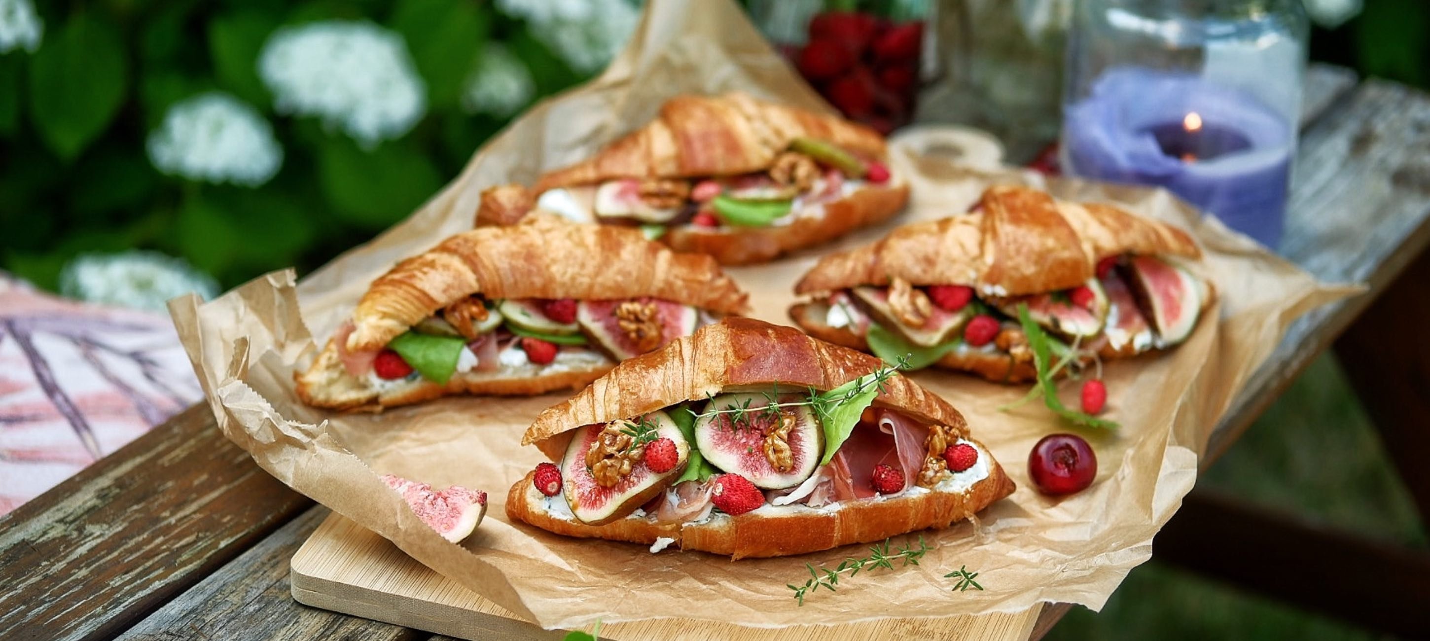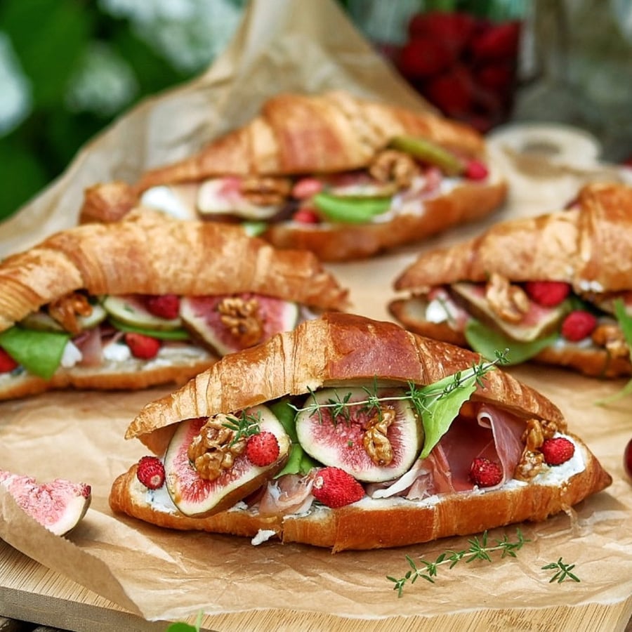 - 3Cut the croissants lengthwise. Spread with the chive spread, layer with spinach and slices of prosciutto. Add sliced figs. Sprinkle with fresh thyme and nuts.