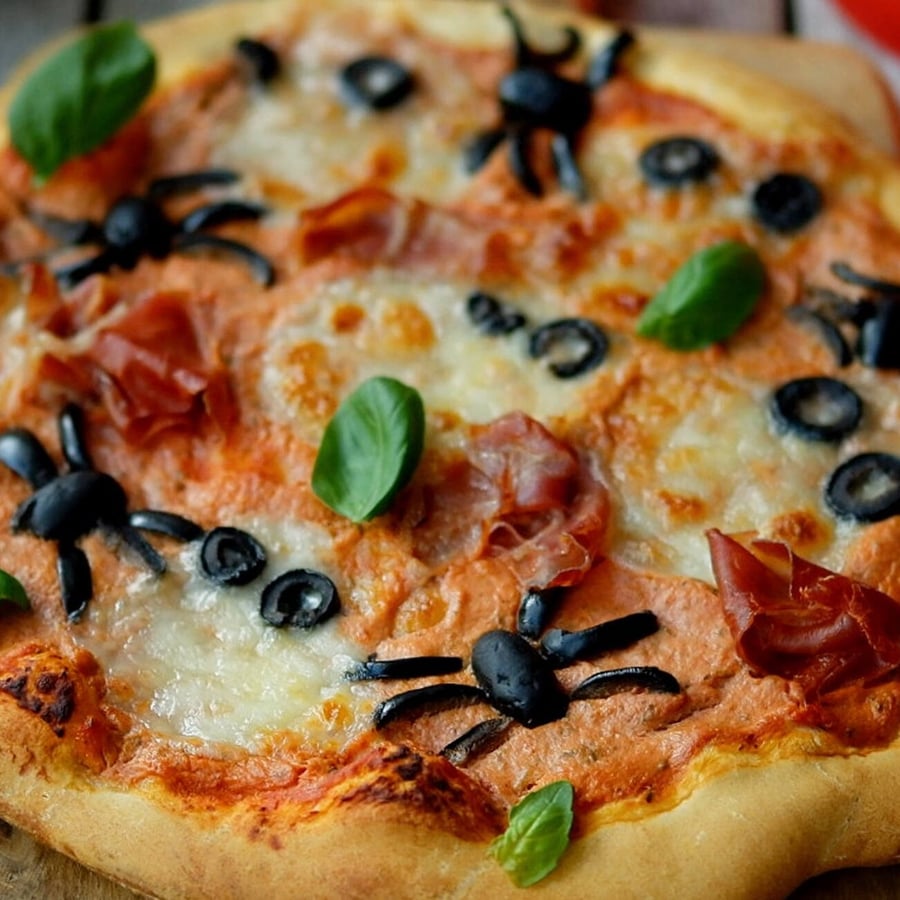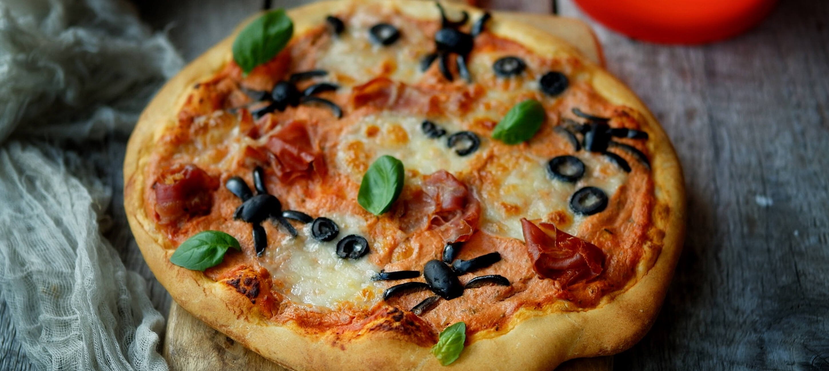- 2Remove from heat and stir in the creme fraiche. Finally, blend everything together. Spread the mixture over the pizza dough, then top with prosciutto and sliced mozzarella. On top of that, arrange black olives to form a ghost's face, and also create spiders from black olives.