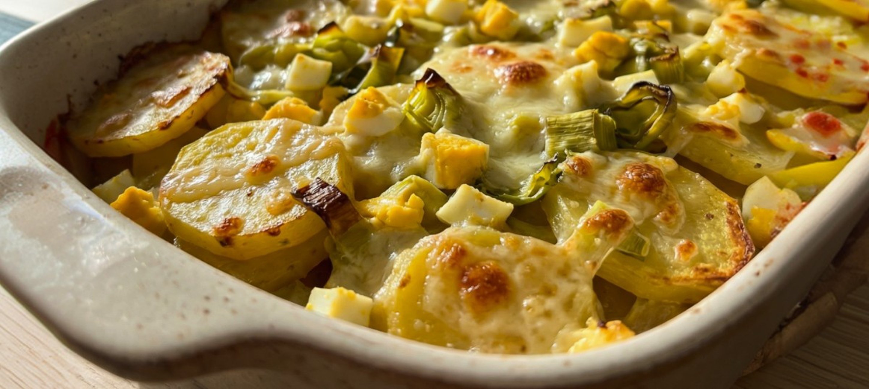 - 3Layer the potatoes, leek, and eggs alternately in the baking dish. Lightly salt and pepper each layer.