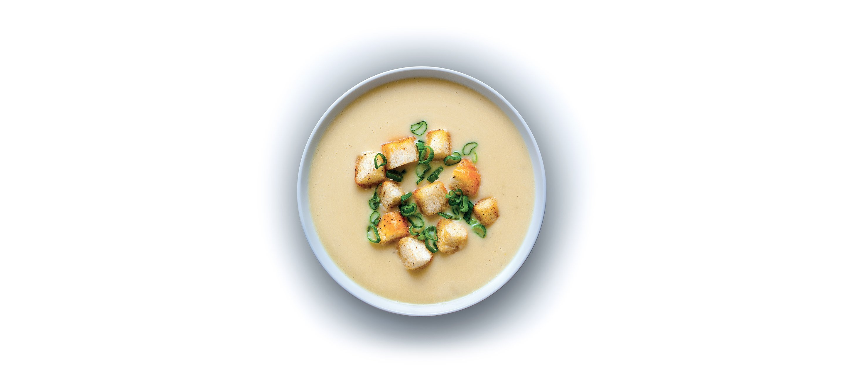 - 4Stáhneme z ohně, přidáme máslo nakrájené na kostky a rozmixujeme tyčovým mixérem. Dle chuti osolíme a podáváme s krutony a jarní cibulkou.