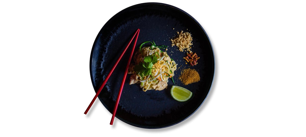 - 3Mix in the pre-soaked noodles and then add all the seasonings at once (sugar, soy sauce, fish sauce, tamarind paste) and finally toss in the leek and spring onion. Garnish the finished Pad Thai noodles with peanuts, coriander, chili, and fried onion.