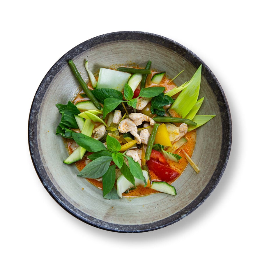 - 1Na malém množství oleje osmažíme maso, a poté přidáme kari pastu. Ve chvíli, kdy jsou pasta a kuře dobře promíchány, zalijeme vývarem a přidáme kokosové mléko. Citronovou trávu v ruce nalámeme a společně se sušenými limetovými listy přidáme do pánve. Hned poté začneme ochucovat. Přidáme cukr, rybí omáčku a šťávu z limety. Až jako poslední přidáme zeleninu, kterou ale nevaříme déle než 2 minuty.